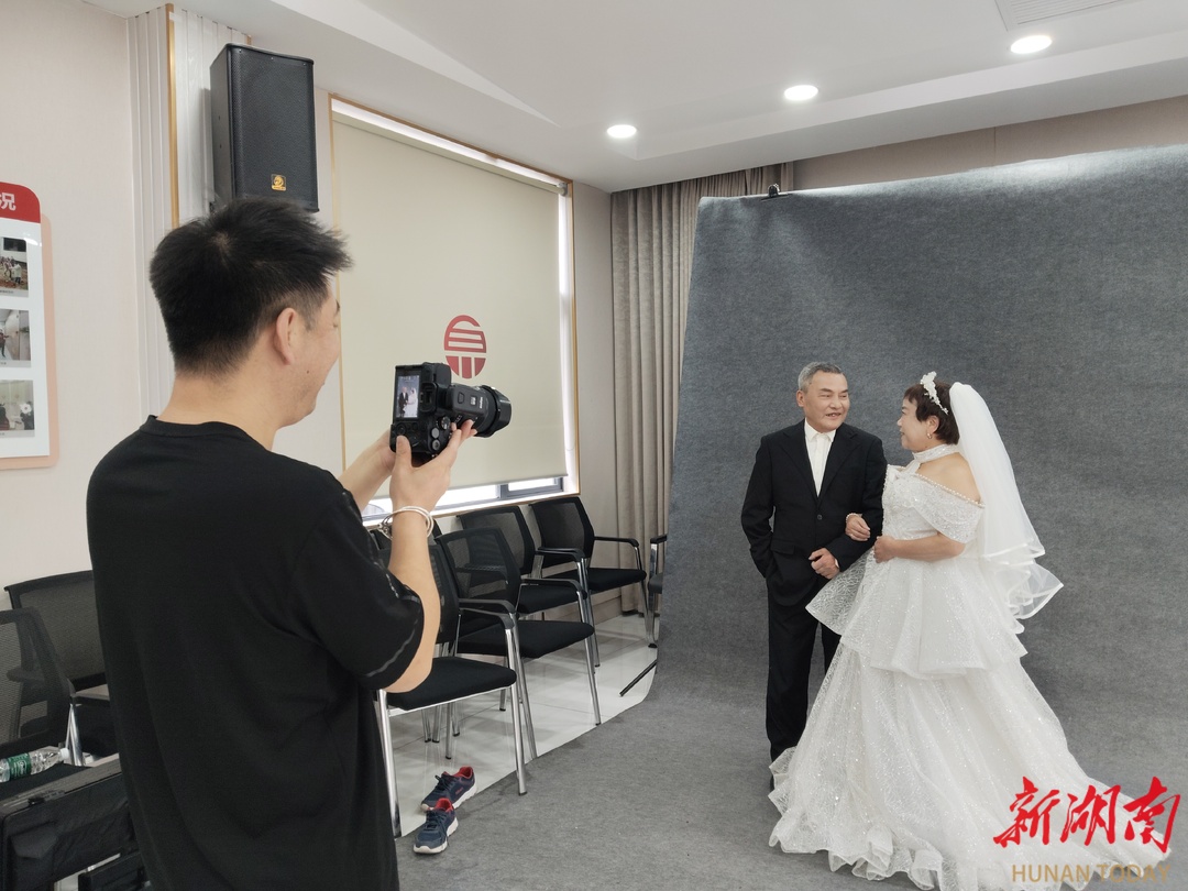 活动当天,社区一楼院里满是惊喜:挂着老物件的怀旧场景悄悄搭好,叠得整整齐齐的服装铺满衣架,既有印着岁月痕迹的复古款,也有透着鲜活气息的特色款,任老人们挑选。更贴心的是,专业志愿者早早守在化妆区,拿起梳子、蘸上粉底,细细为老人们打理发型、描画妆容,不一会儿,原本精神的长辈们,又多了几分精致与神采,对着镜子笑个不停。“来,叔叔阿姨靠近一点,看着对方笑一笑!”“全家再往中间凑凑,把幸福都装进来!”现场最热闹的,要数拍摄区。湖南省民俗摄影协会的专业志愿者们,举着相机来回调整角度,耐心引导着老人们摆姿势、找表情。不管是相伴几十年、想补张结婚纪念照的老夫妻,还是全家陪着长辈来拍全家福的大家庭,在镜头定格的瞬间,眼里的笑意、彼此的牵挂,都成了最珍贵的画面。这一张照片,装下了秋日的诗意,也藏着家庭的温情;一场活动,拉近了邻里的距离,更传递了社区的关爱。