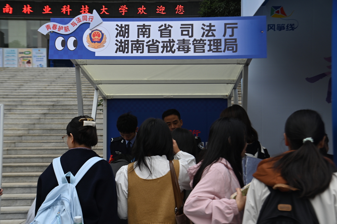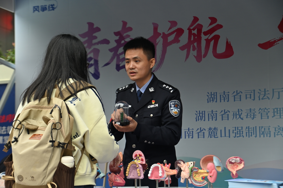 “吸毒是违法行为,还是犯罪行为?”“出于义气把自己房间借给朋友吸毒,会不会惹上官司?”场外禁毒戒毒宣传展台前,省麓山强制隔离戒毒所“风筝线”禁毒戒毒普法志愿者团队的警察们用一连串紧贴现实的提问,向大学生们科普禁毒戒毒知识,把大学生群体所面临的涉毒法律风险讲清楚、说明白。