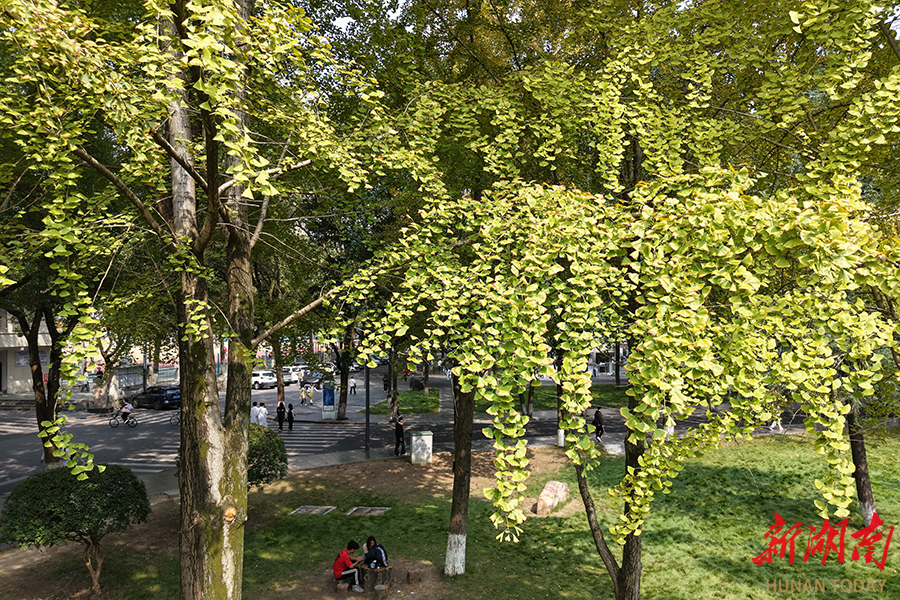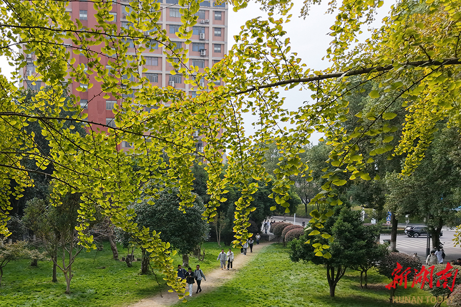 10月29日,吉首大学校园内的银杏树逐渐披上“黄金甲”,铺就一条金色大道,师生悠然漫步其间,构成一幅动静相宜的校园秋景图。彭彪 摄(湖南图片库)