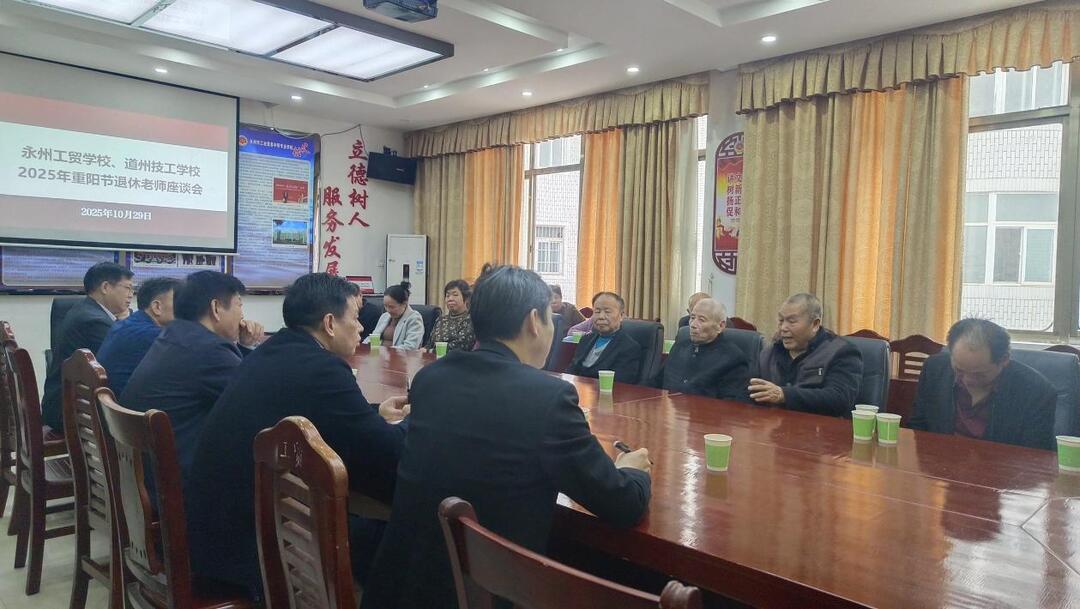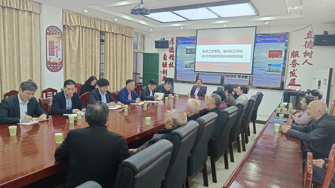 10月29日上午,永州市工业贸易中等专业学校(以下简称“永州工贸学校”)在校园内举办2025年重阳节退休教师座谈会。数十位曾为学校发展奉献青春与智慧的老领导、老教师重返校园,与学校领导班子欢聚一堂,共叙情谊、共话发展。座谈会由学校党委副书记、校长何月军主持。