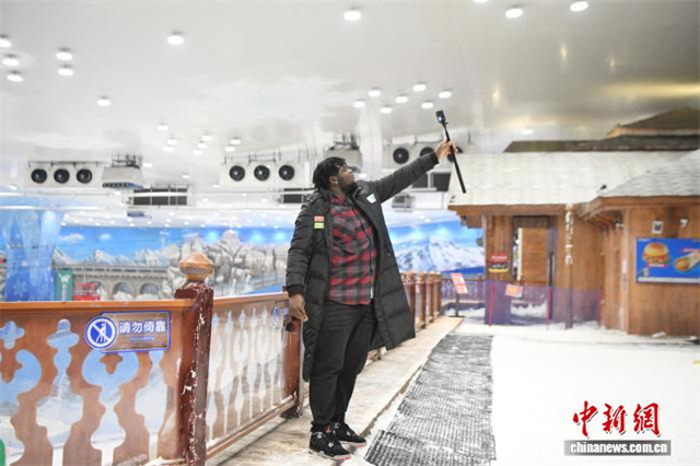 The photo shows a foreign media representative posing for photos at the Happy Snowfield. (Photo/Yang Huafeng)