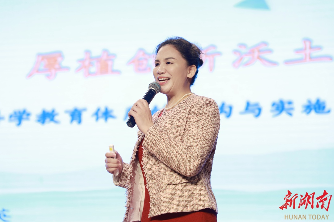 株洲市二中附属小学党总支书记、校长彭小英以“播下科学种子,点亮创新梦想”为主题,介绍了学校在科学教育方面的实践与成果。她表示,学校构建了“文化—课堂—活动—评价”四位一体的科学教育体系,致力于为每一个孩子提供激发科学潜能的土壤,唤醒学生的潜能,助其蓬勃生长。