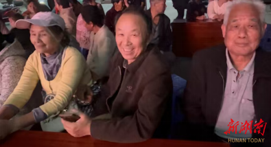 有的老人安静地坐在自家“慢慢游”里,摇下车窗,看得津津有味;有的三五成群,围在栏杆旁,跟着熟悉的旋律轻声哼唱。一位银发老人看到精彩处,使劲地鼓掌,脸上的皱纹都笑成了花。
