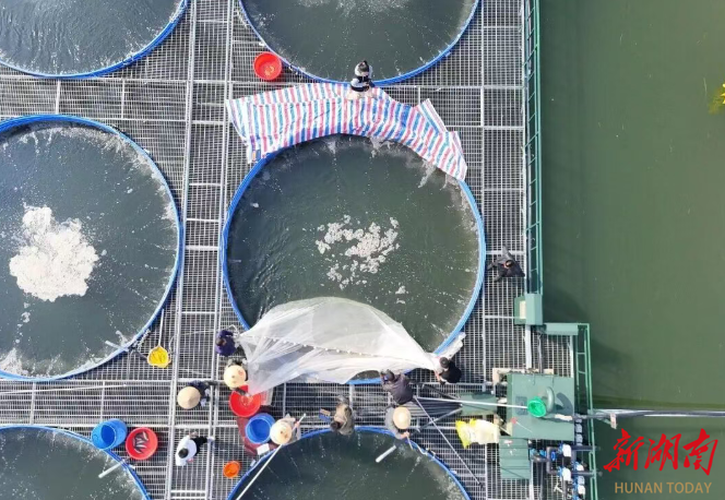 上午九点,位于君山区的湘北良种场水基设施基地内一片繁忙。工人们正紧锣密鼓地进行第二次起鱼作业,肥美的鲈鱼在渔网中翻腾,充满活力。该基地共建有80个水基圈养桶,总有效养殖水体5200立方米,每个圈养桶直径6米,容量65立方米,配备有智能投饵、排污、供氧等系统,形成了一套高效、环保的圈养模式。工人们将鲈鱼从大网中舀出,装入塑料筐,进行初筛,挑选活力良好的个体;称重工人手持电子秤,将每条鲈鱼单独过秤,合格的放入蓝色塑料箱,未达标的则放回旁边的暂养池。经过严格分拣,符合标准的鲈鱼被迅速送入专业活鱼运输车,准备开启前往上海的“新鲜之旅”。