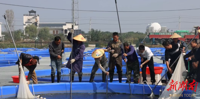 现场,湘北良种场水基设施基地现场负责人周永卓介绍:“今天这是我们第二次起鱼,从早上9点钟一直持续到现在。我们把每条鲈鱼的重量都控制在九两五以上,预估今天产重有7000斤装车(发出)。”