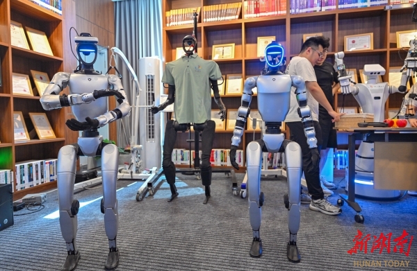 湘江实验室内,人形智能机器人正“列队”展示。郭立亮 邹尚奇 摄