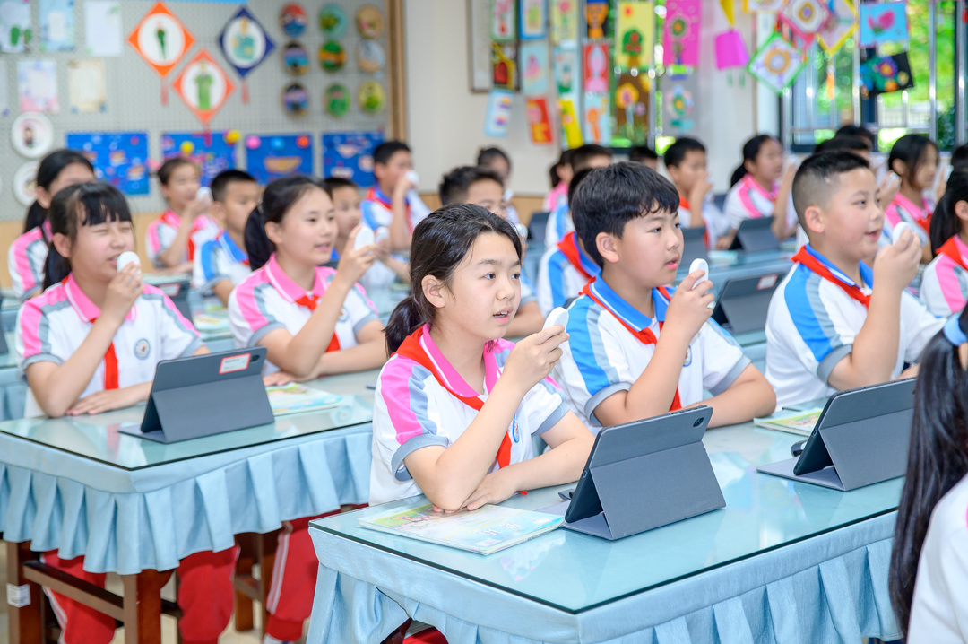 “最明显的改变在英语口语教学上。”博才洋湖小学教师发展中心主任王倩透露,通过将“AI听说智慧课堂”引入英语教学,学生手持语音答题器,就可以开展人机互动练习。智能语音评测系统会实时反馈学生听说水平,并有针对性指导学生纠错,帮助学生快速提升听说能力。
