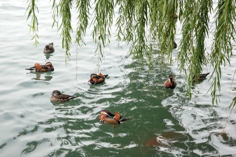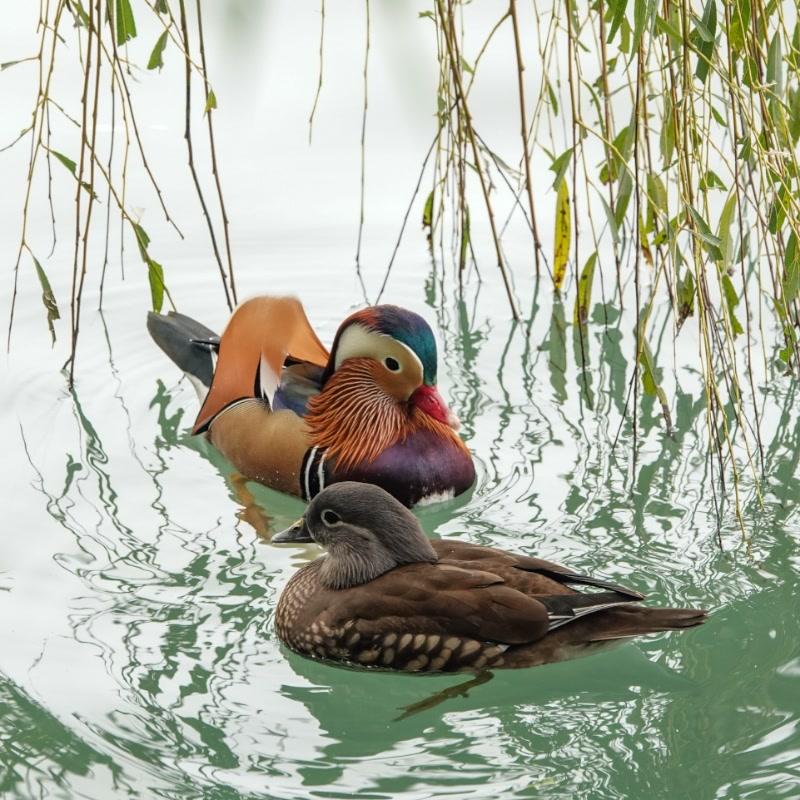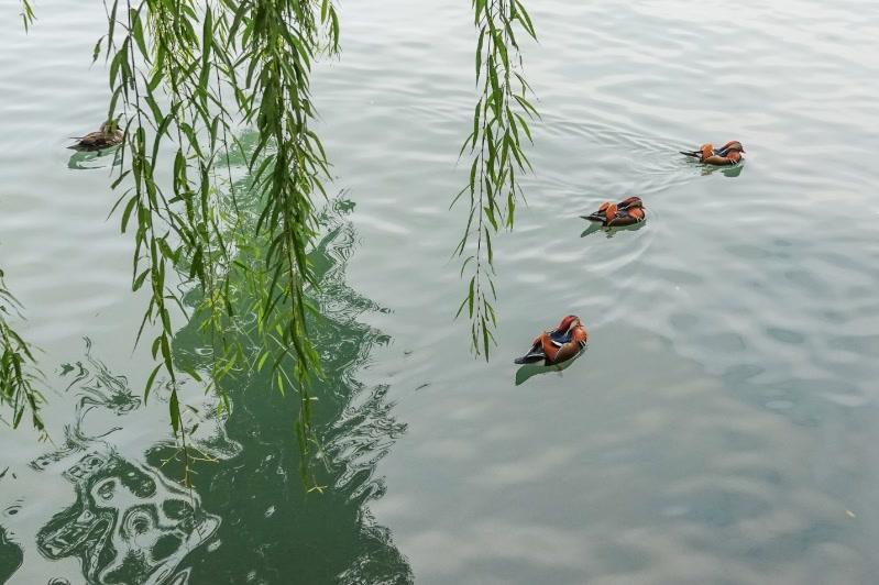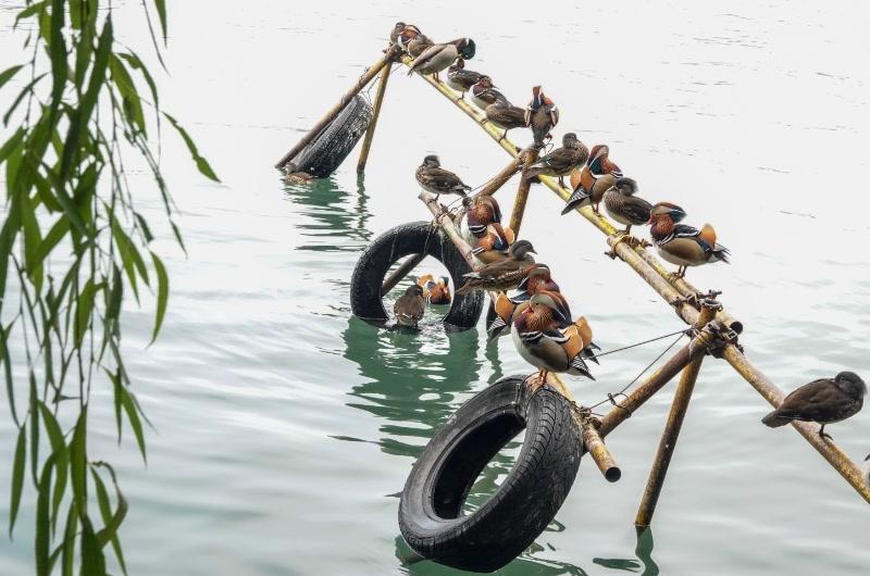北海公园的湖面漾着轻波,一群鸳鸯正自在嬉戏,红喙点水,彩羽掠波。不远处的铁架子上,一排鸳鸯静静伫立小憩,颈羽蓬松,神态安然。一动一静间,尽是自然生灵的惬意与灵动,为湖景添了几分生机与闲适。