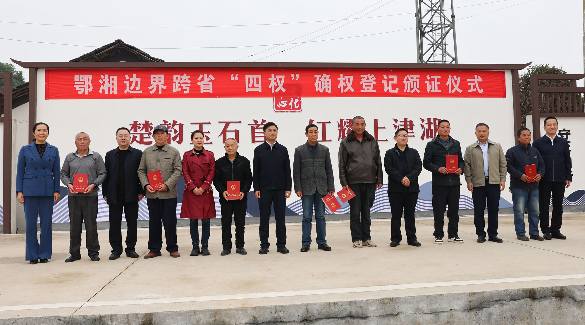湖北省自然资源厅总工程师孙燕,石首市委常委、副市长程鹏,岳阳市自然资源局总工程师陈洪俊,华容县委常委、副县长涂娟,以及鄂湘两省、相关地市的负责人共同为村民颁发不动产权证书。