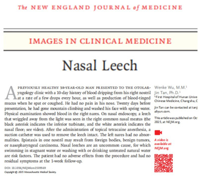 湖南日报10月31日讯(通讯员 韩远山 雍苏南 全媒体记者 周倜)记者今天从湖南中医药大学第一附属医院获悉,近日,该院耳鼻咽喉头颈外科副主任医师吴文科作为第一作者、口腔科主任医师谭劲作为通讯作者,在国际顶尖医学期刊《新英格兰医学杂志》(The New England Journal of Medicine,NEJM,影响因子78.5)上报道一例因“鼻腔水蛭”感染引发的单侧鼻出血病例。这是该院首次以第一完成单位在该国际顶刊上发表科研文章,是医院临床科研领域的重大突破。