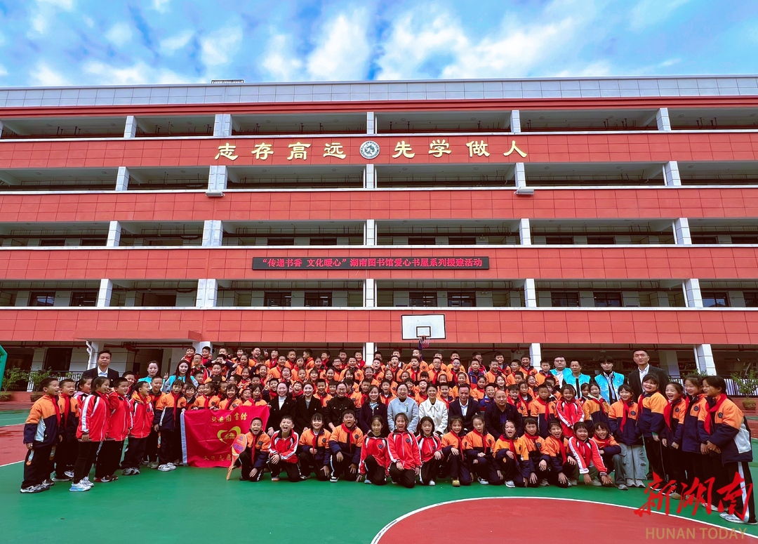 当日下午,捐赠仪式在学校操场举行。2至5年级学生身着校服、佩戴红领巾整齐列队,主持人介绍活动背景后,校长黄吉凤致谢并勉励学生爱阅读、惜图书,湖南图书馆读者活动部主任李婷阐述文化援建意义,学生代表彭梓宸承诺以书为友、回报社会。随后,图书馆捐赠图书并授“爱心书屋”牌匾,全体人员合影留念。