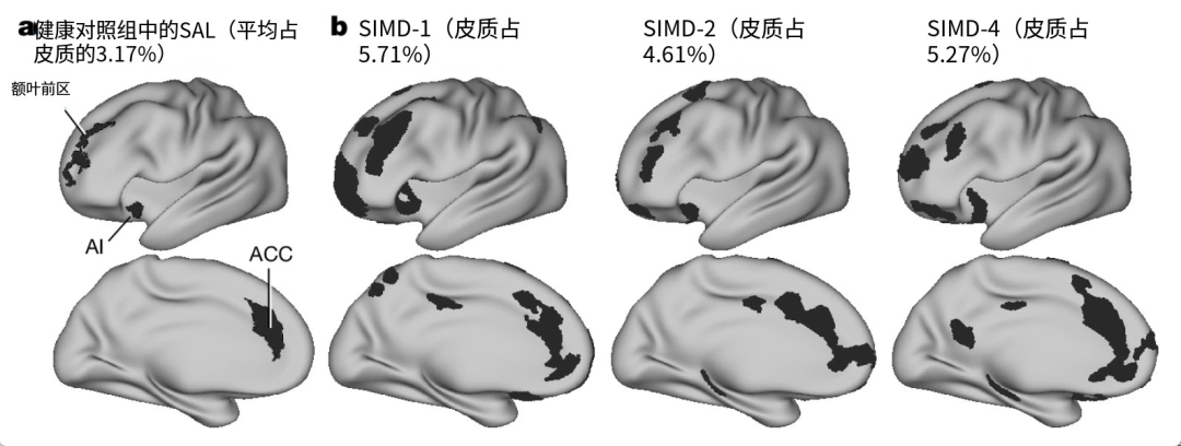 在大量样本的抑郁症患者皮层中,前纹状体显着网络扩大了近两倍:a、显著性网络(黑色)在 LPFC、ACC 和 AI 中有代表性。b、来自数据集的三个代表性个体的显著性网络丨参考资料 1