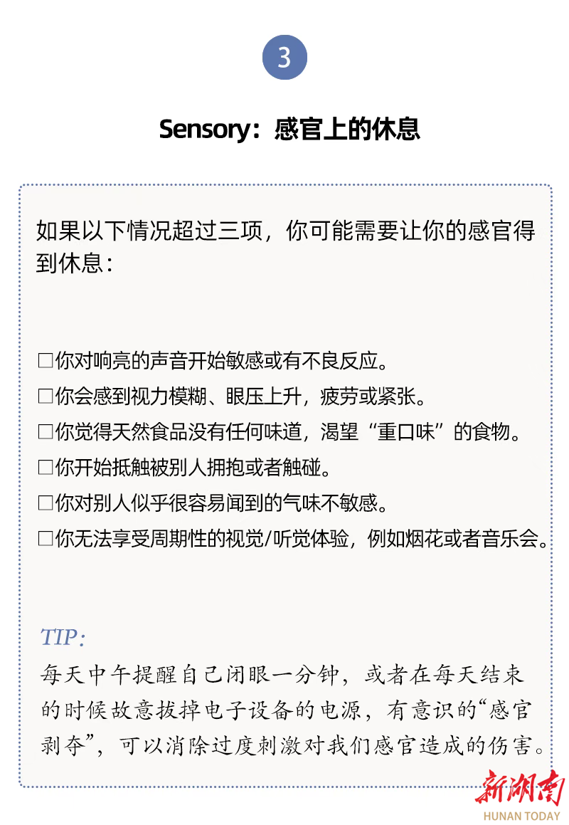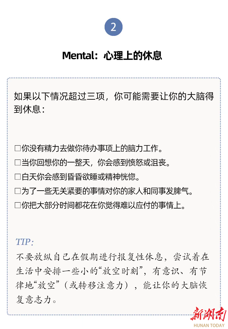 人们对于休息有不同层面的需要,休息与每一天的生活息息相关。单靠某一个具体的假期、某一种具体的活动(社交或者睡觉),并不能让我们恢复到完全休息好了的状态。