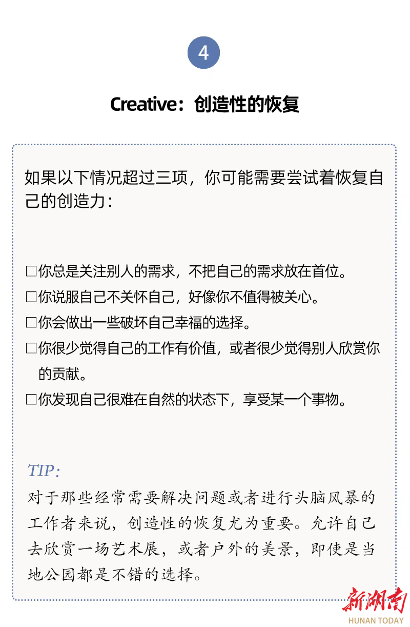 真正的休息,能够帮助你从受外部刺激影响转向调整自己的身体、思想和感受。当你选择了适合自己的休息方式,集中注意力,就会和自己联系起来,回到当下。
