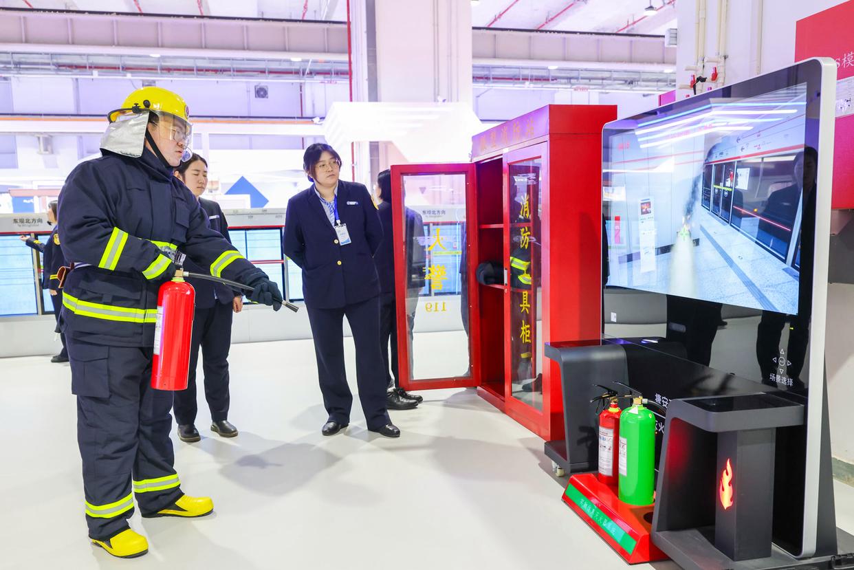 在北京地铁东坝实训基地,学员在站厅站台应急处置实训区学习消防知识。东坝训练基地分为理论教学和实操培训两大区域,理论教学区设7间教室,可同时容纳560人培训;实操培训区使用面积4000平方米,可满足184人同时培训。按专业特点设置的综控、乘务、检修、站务、设备综合巡检、通用安全等六大实训区共可设置突发情况处置点1730个。地铁员工可以在这里练习救援联挂和手摇道岔、车门检修和电气装调,还可以在一比一复原的车站综控室、票务室、信号楼等高度仿真的实训环境进行实操训练。基地启用以来,已开展单点课程培训3000余人次。