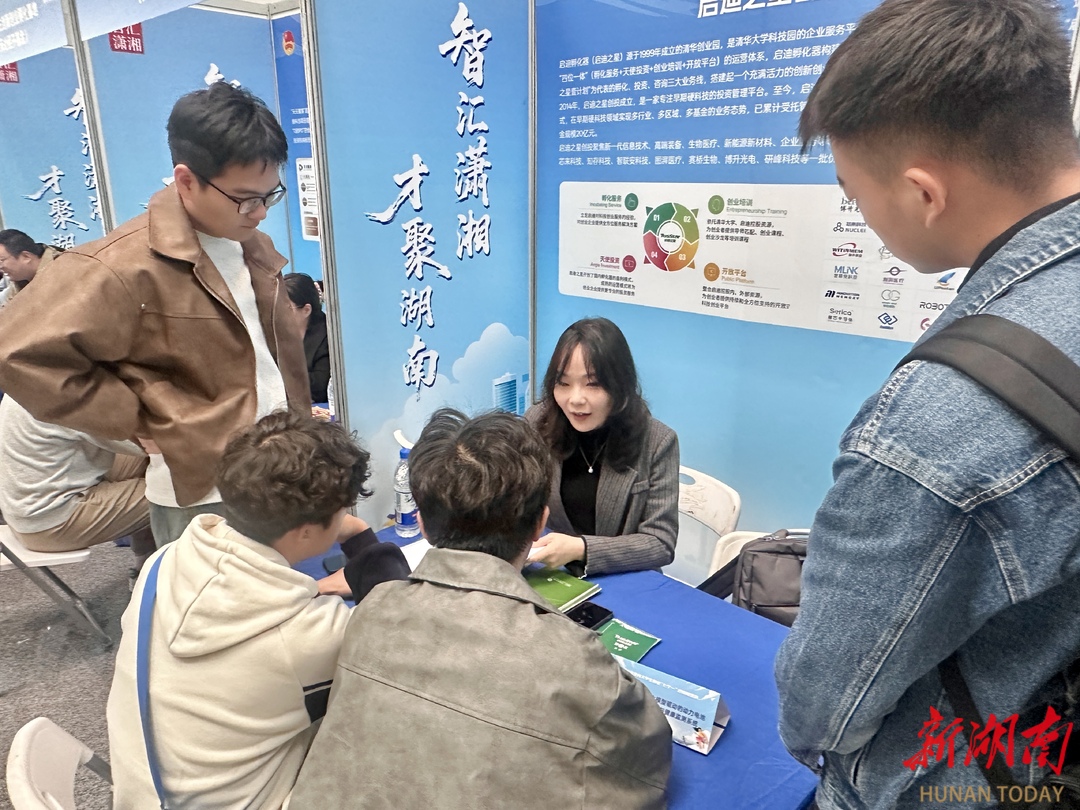 启迪之星(长沙)执行总经理李曾仔细翻阅着他们的项目计划书,不时提问:“技术壁垒体现在哪里?市场推广思路是什么?”团队成员你一言我一语地补充,听完专家的建议,四人转身又扎进隔壁湖南省大学生创业投资基金的展位,继续了解创业政策……