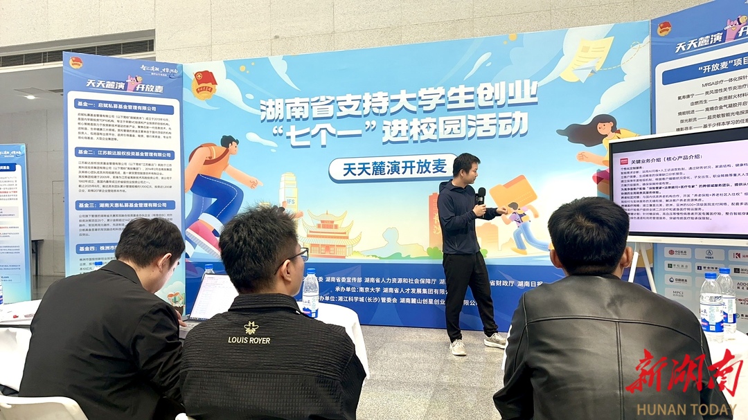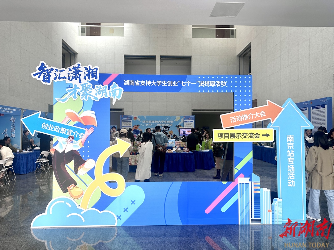 这里正在举行的,是“智汇潇湘 才聚湖南”创业政策宣介会暨湖南省支持大学生创业“七个一”进校园活动,活动以投资洽谈、政策推介、项目路演、创业分享为纽带,向江苏高校学子递出“来湘创业”的橄榄枝。