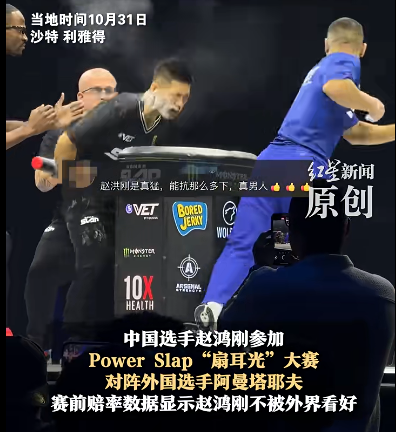 10月31日,沙特利雅得,中国选手赵鸿刚参加世界职业扇耳光大赛,对阵外国选手阿曼塔耶夫,第三回合被对手KO痛苦倒地,脸色惨白。比赛中,他眉角受伤需缝针,眼睛淤青。