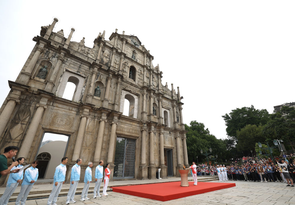 ↑ 火炬手罗协铭在大三巴牌坊前进行火炬传递。新华社发(张金加摄)