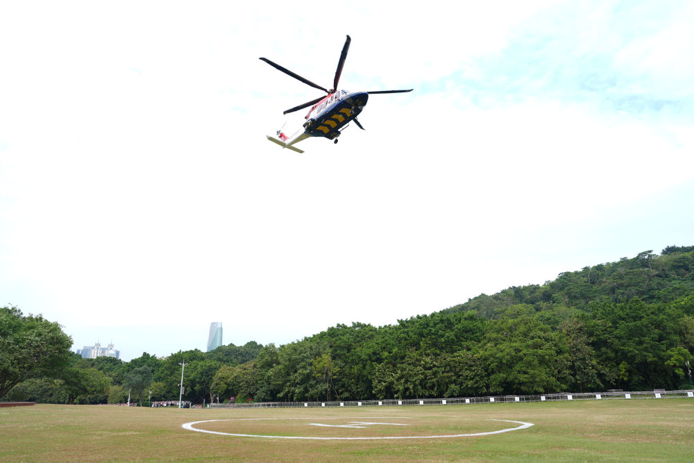 ↑ 搭载圣火的直升机进行空中传递。新华社记者 梁旭 摄