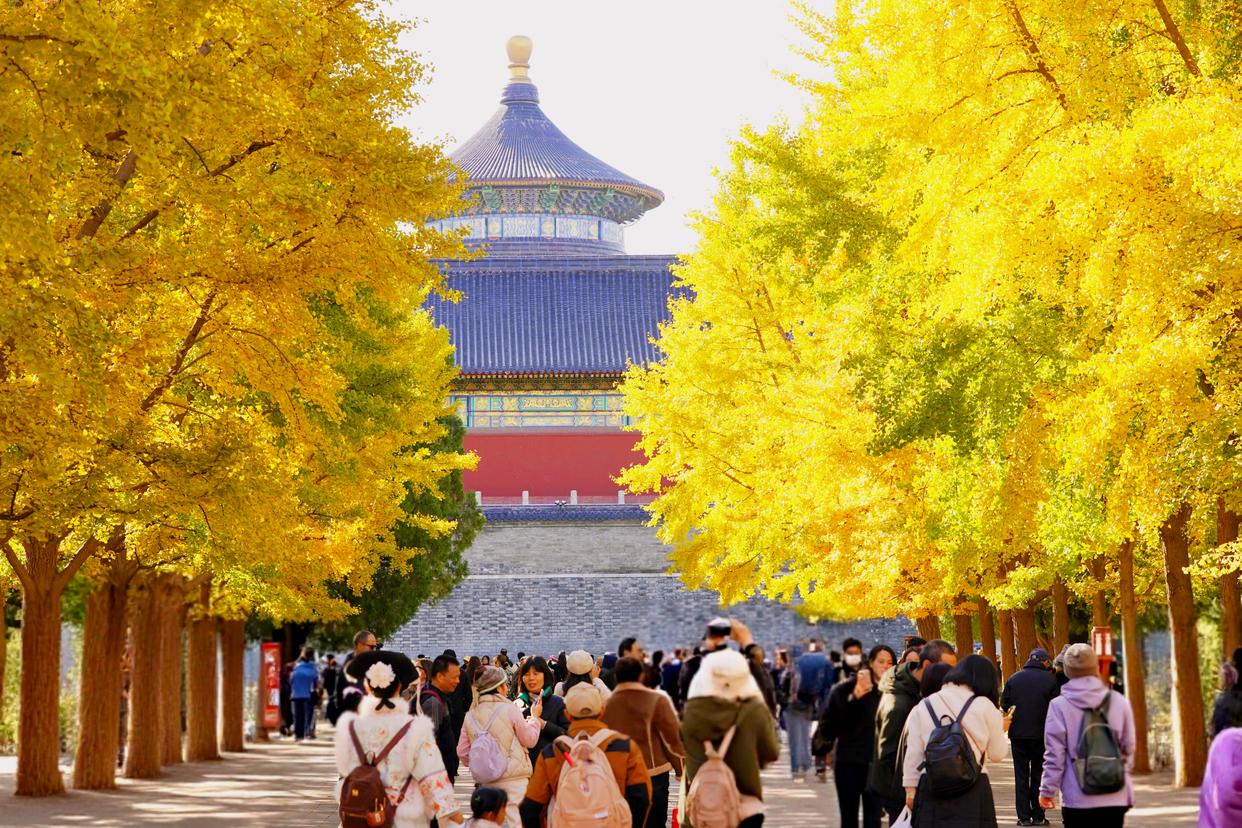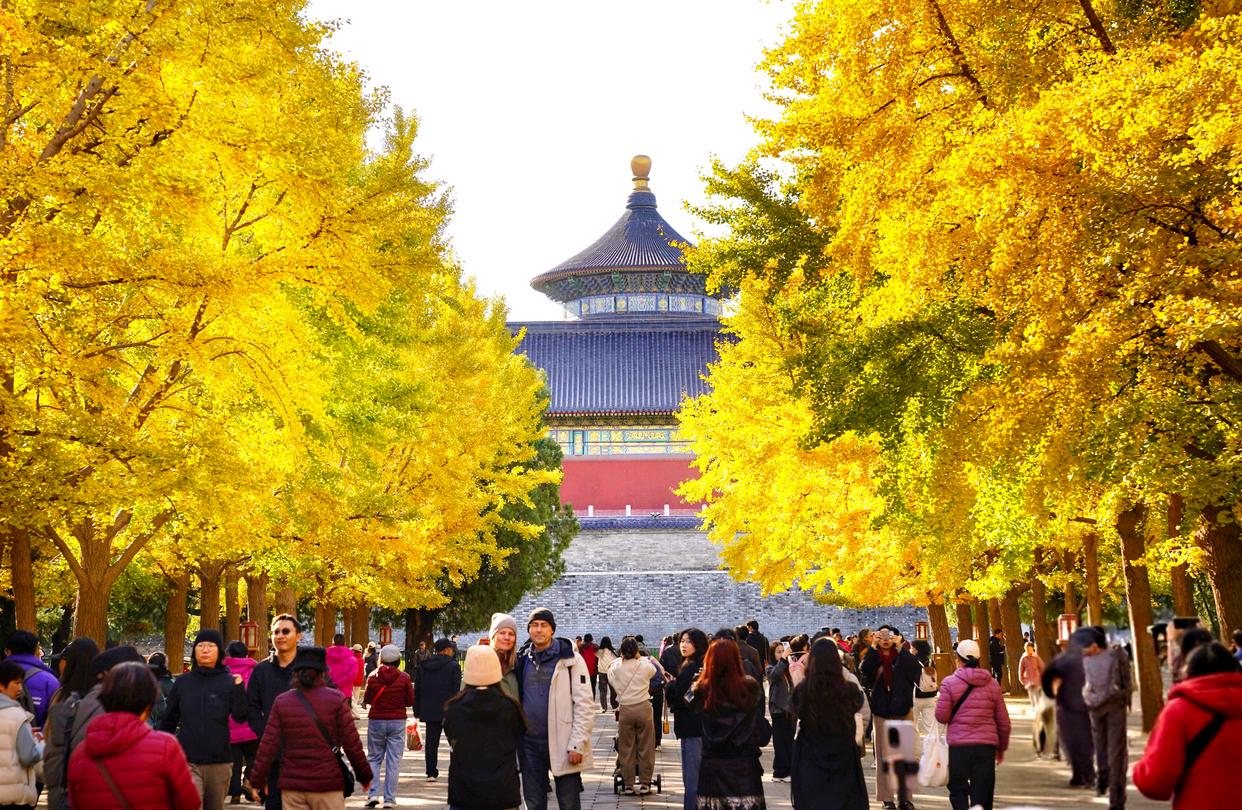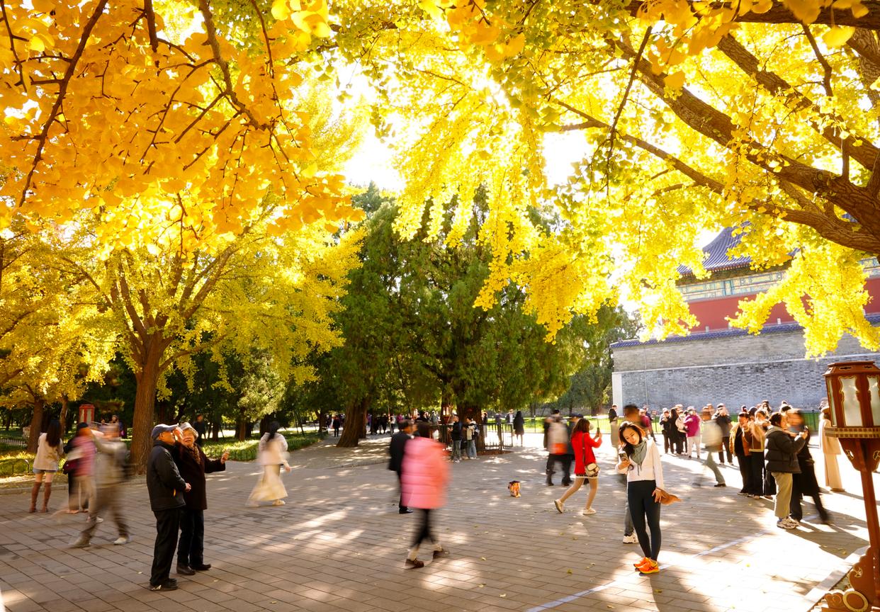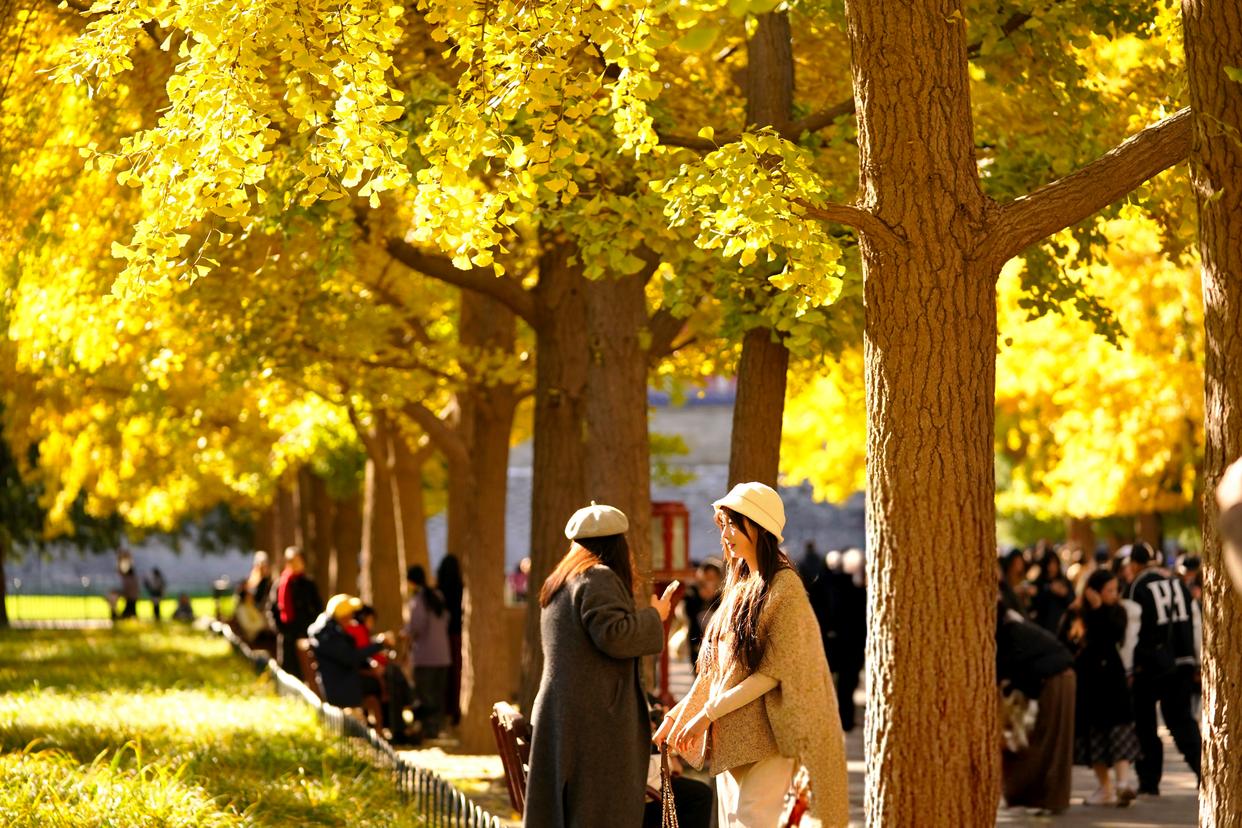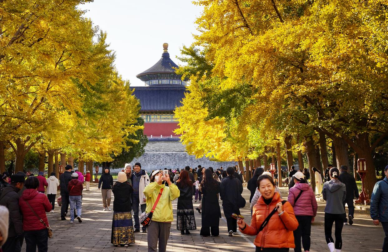 深秋时节,天坛公园银杏大道迎来最佳观赏期。大道两旁银杏树褪去翠绿,换上“金衣”,阳光穿透枝叶洒落,形成一条百米长的“秋色长廊”。漫步其间,金黄的叶片与红墙碧瓦、古柏苍松相映成趣,古老建筑群在银杏的映衬下更显庄重典雅。游客们驻足拍照,定格光影交错的美景。