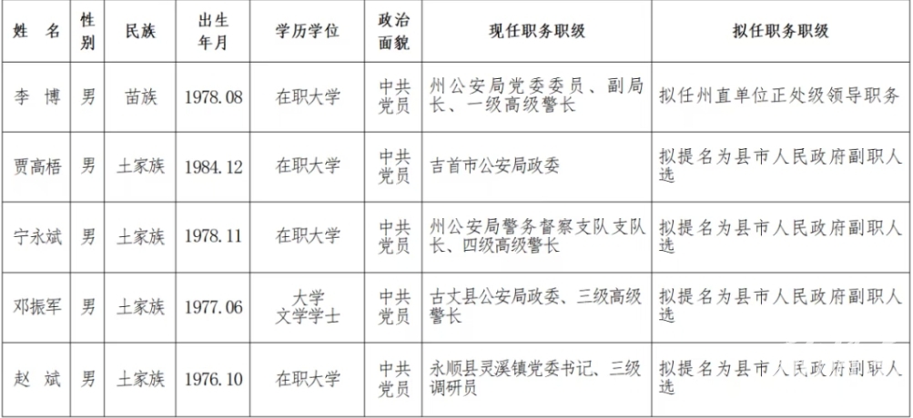 湖南日报·新湖南客户端11月2日讯(记者 李孟河)今天,湘西土家族苗族自治州委组织部对州委常委会会议研究决定的下列5名拟任职人选予以任前公示,以加强对干部选拔任用工作的监督,提高识别和任用干部的准确度。