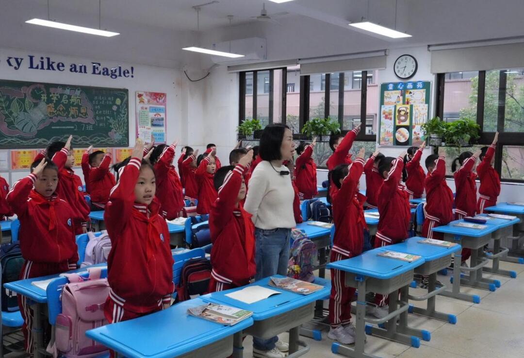 全体师生肃立于教室内,凝望着教室前方的五星红旗。少先队员们挺直脊背,高举右手行队礼,目光如炬;教师们神情庄重,肃立注视。