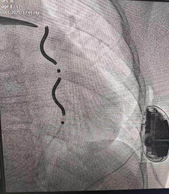 10月29日上午,心胸外科、心血管内科、麻醉科等多科室专家协同作战,为辰辰实施EV-ICD植入手术。术中,团队通过胸骨下方的微小切口,将专用血管外除颤导线精准植入胸骨后间隙,再与埋在左侧腋下的除颤器主机连接。这种导线系统完全避开心脏和血管,依靠胸骨后贴近心脏的解剖位置,实现对心律失常的监测与治疗。