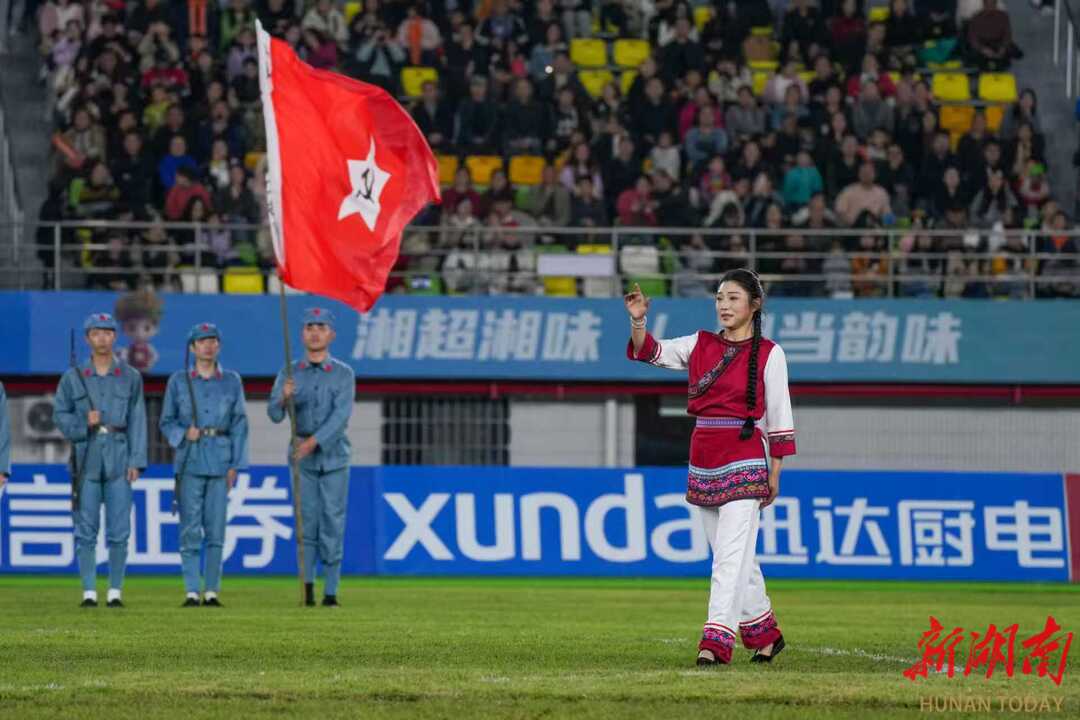 今年是中国工农红军第二方面军长征出发90周年,1935年11月19日,贺龙、任弼时等率领红二方面军主力从桑植刘家坪、瑞塔铺誓师突围,踏上艰苦卓绝的长征路;其所属红十八师留守茨岩塘牵制敌军,于同年12月8日完成任务后出发长征,在中国革命史上留下了浓墨重彩的篇章。作为贺龙元帅的故里、中国工农红军第二方面军长征的出发地,桑植这片红色沃土承载着厚重的革命记忆,拥有124处革命遗址遗迹,是天然的红色基因库。此次军旗亮相湘超赛场,正是将红色历史与现代体育激情相融合的生动实践,让观众在赛事热血中触摸历史温度。
