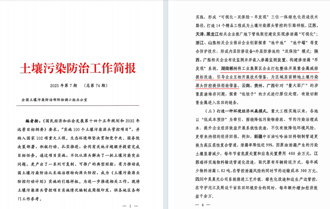 在《土壤污染防治工作简报》(2025年第7期)中,郴州市将工业集聚区内企业打包整体推进重金属减排提标改造的做法被列为典型经验推广:“湖南郴州将工业集聚区企业打包整体开展重金属减排提标改造,引导企业互相开展技术借鉴,为区域层面耕地土壤污染源头防控提供经验借鉴”。