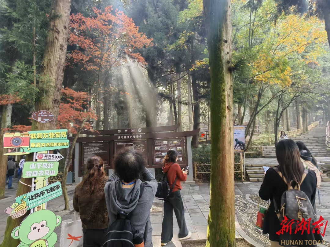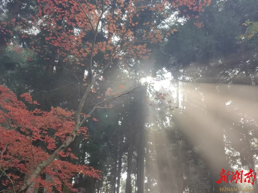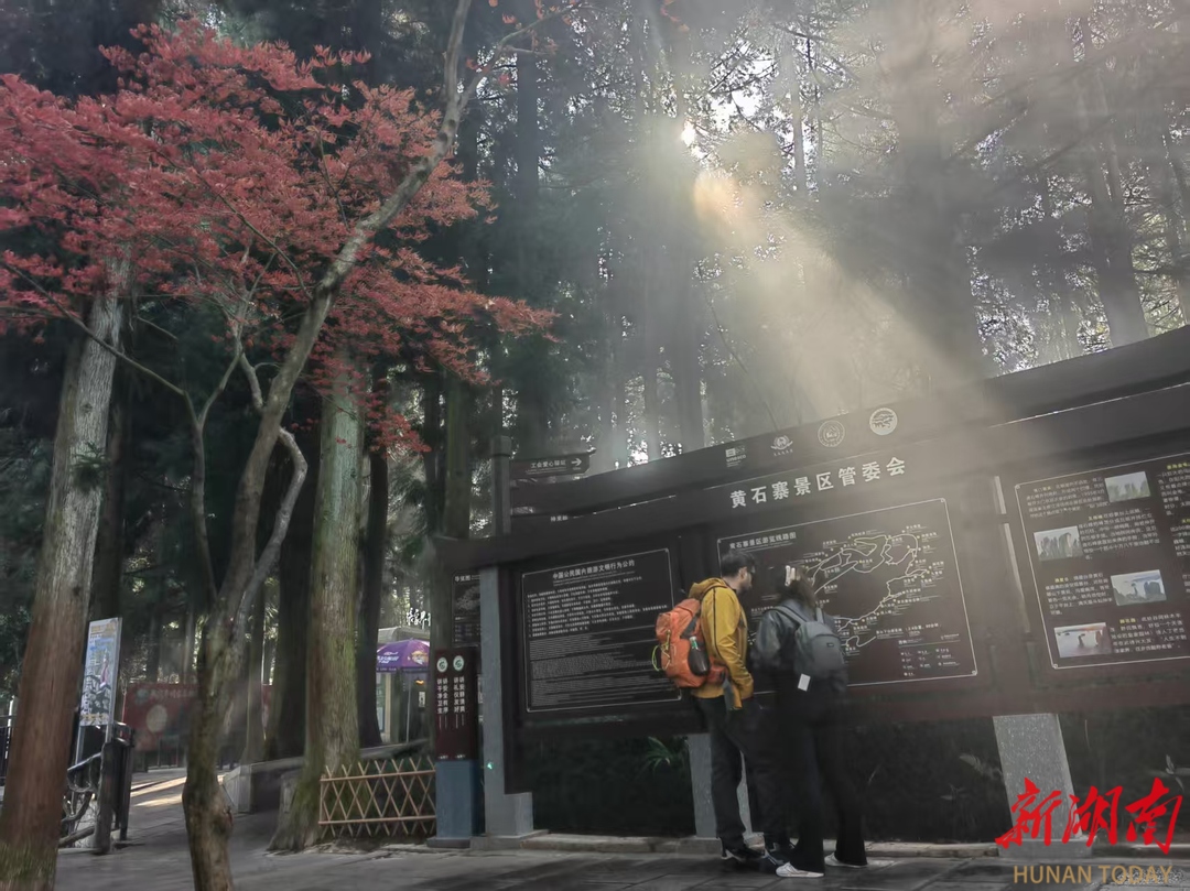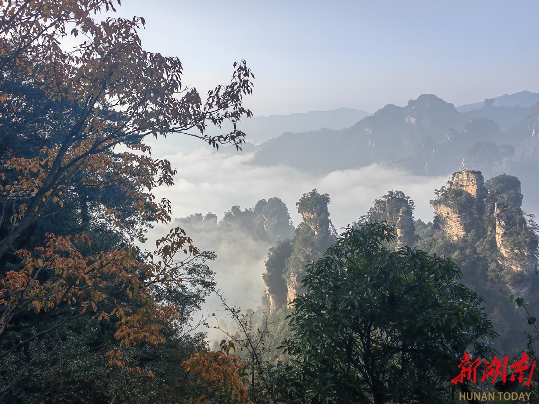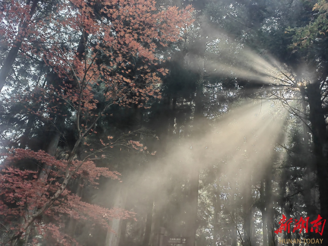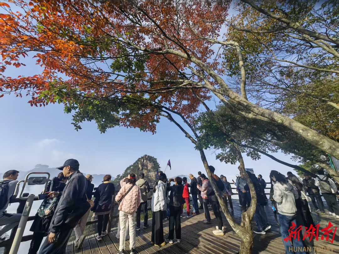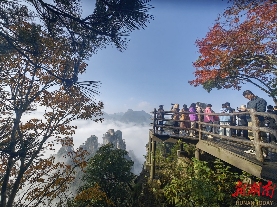 11月4日晨,张家界国家森林公园黄石寨景区,阳光穿过森林和云雾,照在叶子变红的树枝上,形成的光影图画宛如仙境引来中外游客拍照。湖南日报·新湖南客户端通讯员 邓道理 摄影报道