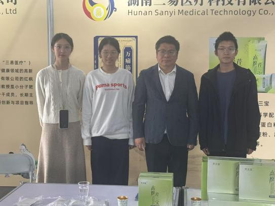 作为医学部创新创业中心执行主任、湖南省第二批大学生创业导师,陶晓军副教授深耕“科研-实践-孵化”一体化育人模式,此次带队参展的两款产品均是校企协同、校地联动的创新结晶。其中,“万痛筋骨贴”以郴州市桂东县民间中草药爬岩红为主药,专为坐骨神经痛、肩周炎等老年高发神经放射性疼痛研发,其组方与工艺历经原料筛选、临床验证等多轮打磨,已形成成熟的产业化应用体系。该项目曾斩获全国大学生生命科学竞赛一等奖,获长沙市红枫计划20万元创业基金支持,更孵化出湖南三易医疗科技有限公司;陶晓军副教授在挂职桂东县科技副县长期间,还积极推动爬岩红种植技术改良与规模化培育,让深山草药真正成为赋能乡村振兴与老年健康的“黄金草”。