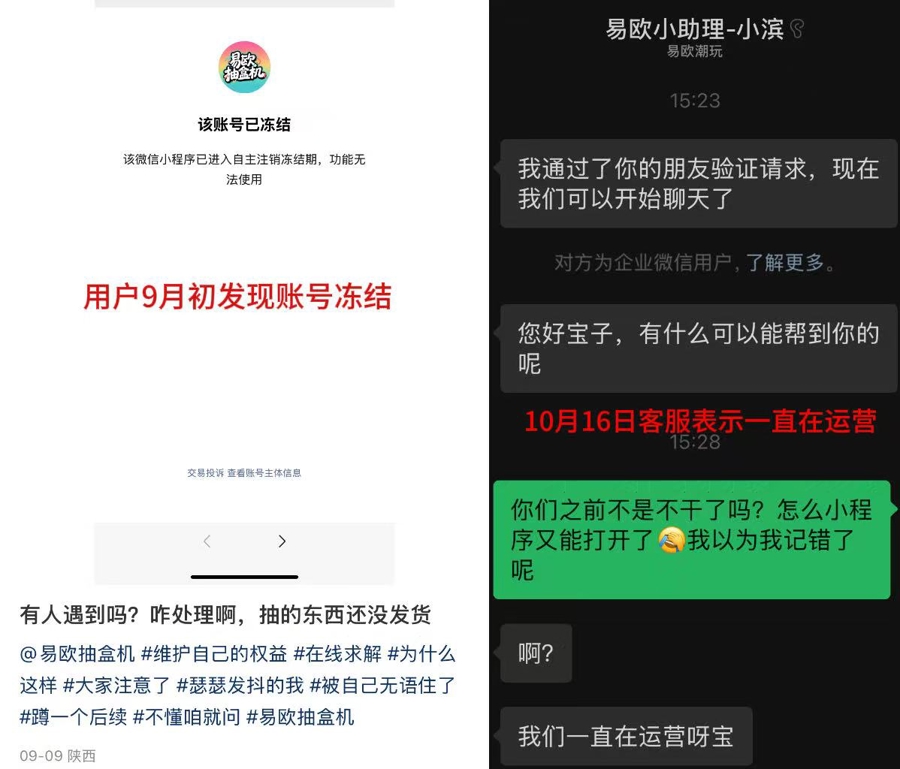 “还有的盒机老板选择赚一波钱,就把盒机转让掉,或者改名继续运营。”熊女士告诉记者。记者在调查中发现,一款名为“易欧抽盒机”的小程序似乎就是循着这一路径,消费者西瓜曾抱着“试一试”的心态进入易欧抽盒机花费了200余元,9月初,她发现该小程序已停止运营,无法申请发货,也联系不上客服了,奖品只能“打水漂”。在社交媒体上不少玩家的截图中,“易欧抽盒机”曾经的运营方为“杭州破壳而出电子商务”,而当记者10月16日再度搜索,这一小程序的主体变更为“海口珠平科技有限公司”,重新开启了运营。富贵抽盒机宣布停止运营的公告中,也表明将其相关设备转让给“闪闪盒机”。