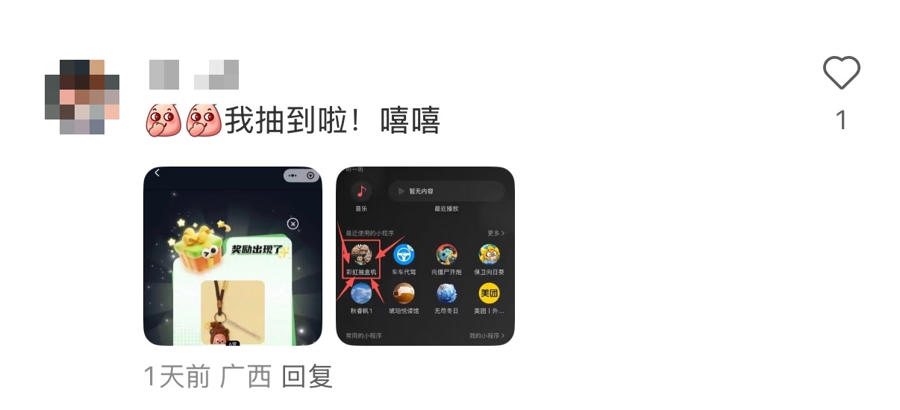 “看小红书上别人在晒抽中大奖,就觉得自己也行!”不少消费者向记者袒露自己试玩抽盒机的心路历程。记者注意到,在社交媒体平台潮玩相关的帖子下方,有很多人回复“抽到啦”并附带一张“盲盒抽中某款”的图片。细看发现,这类图片基本上是“xx抽盒机”小程序的隐性广告,许多抽盒机就这样打着“一发欧中(网络用语,意为抽到大奖)”的旗号进入潮玩爱好者的视线,其宣传的抽中产品则多为迪士尼、泡泡玛特等品牌尚未发售或二级市场价格较高的产品。