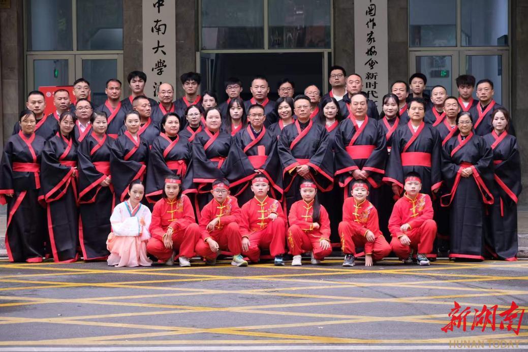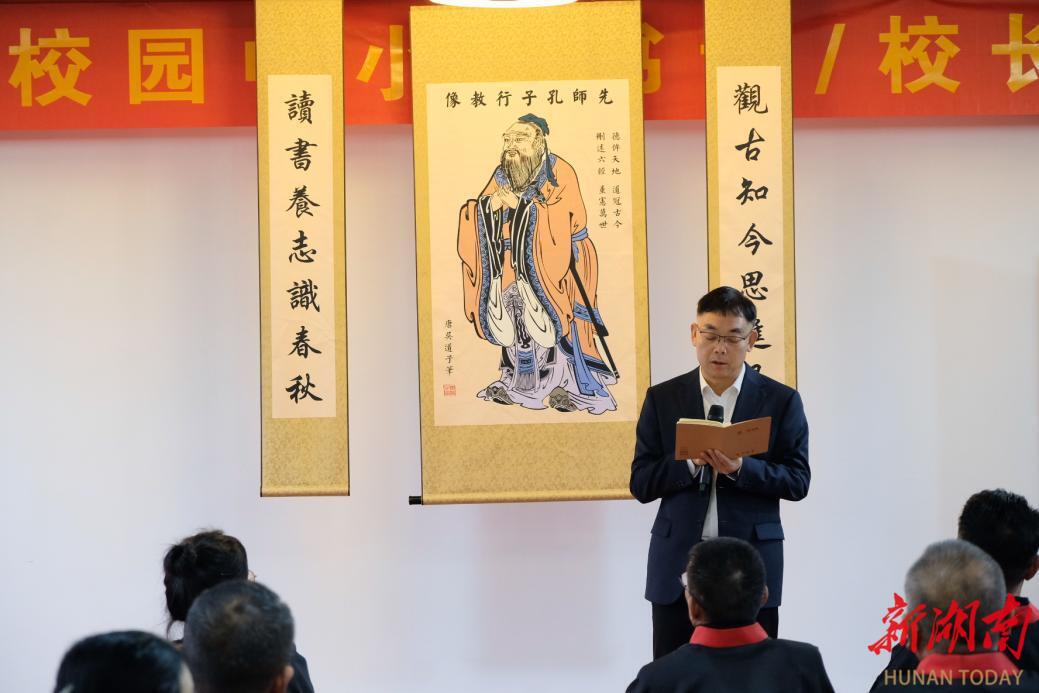 当天,主持人王唯之校长以“赓续文化根脉,培育时代新人”为题开场,他指出,中小学是传统文化教育的“沃土”,唯有深耕细作、创新形式,才能让青少年真正亲近经典、领悟精髓,这与中南大学国学研究中心推动文化普及的理念高度契合。接着,在周校长的带领下,全体参会人员肃立行敬孔礼,整冠、躬身、行礼,每一个动作都饱含对先贤的尊崇与对文化的敬畏;礼毕后,众人移步会场前厅合影留念,镜头定格下这场“以文化为纽带”的相聚瞬间。