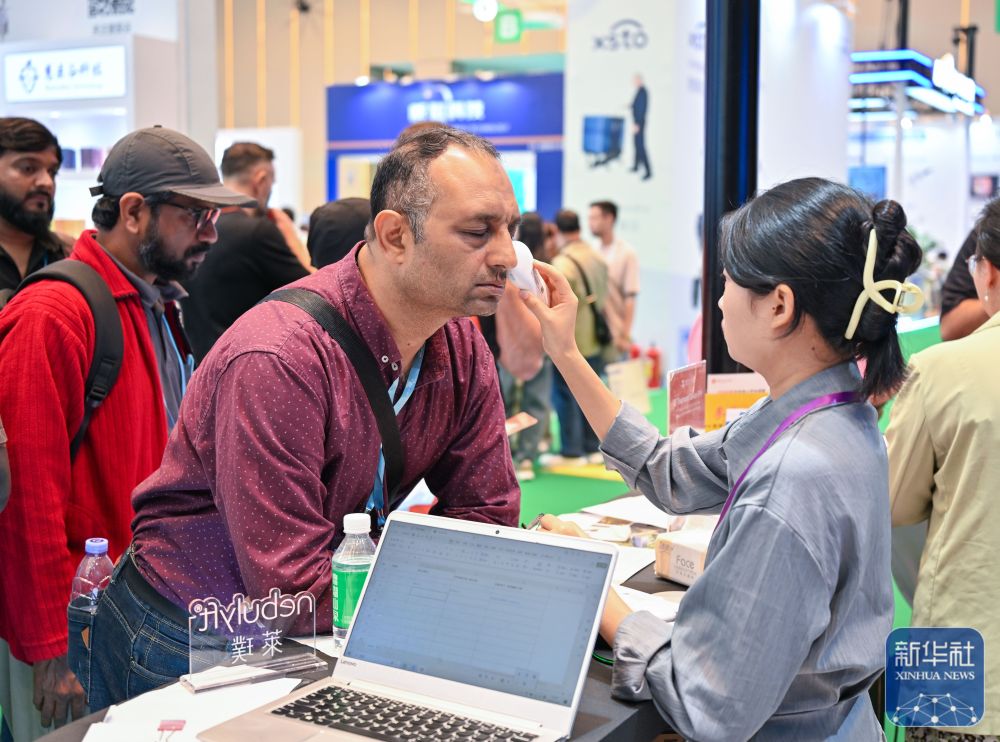 ↑ 11月3日,客商在广交会展馆体验一款美容产品。新华社记者 肖恩楠 摄