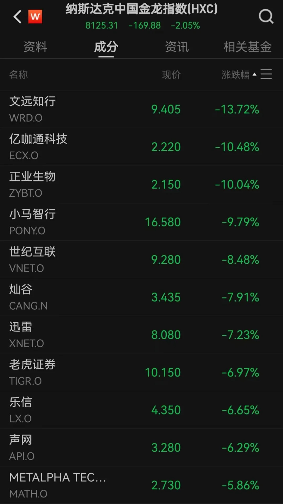 图片来源:Wind热门中概股调整,纳斯达克中国金龙指数跌逾2%。个股方面,文远知行跌近14%,亿咖通科技、正业生物均跌逾10%,小马智行跌近10%,世纪互联跌超8%,老虎证券跌近7%。