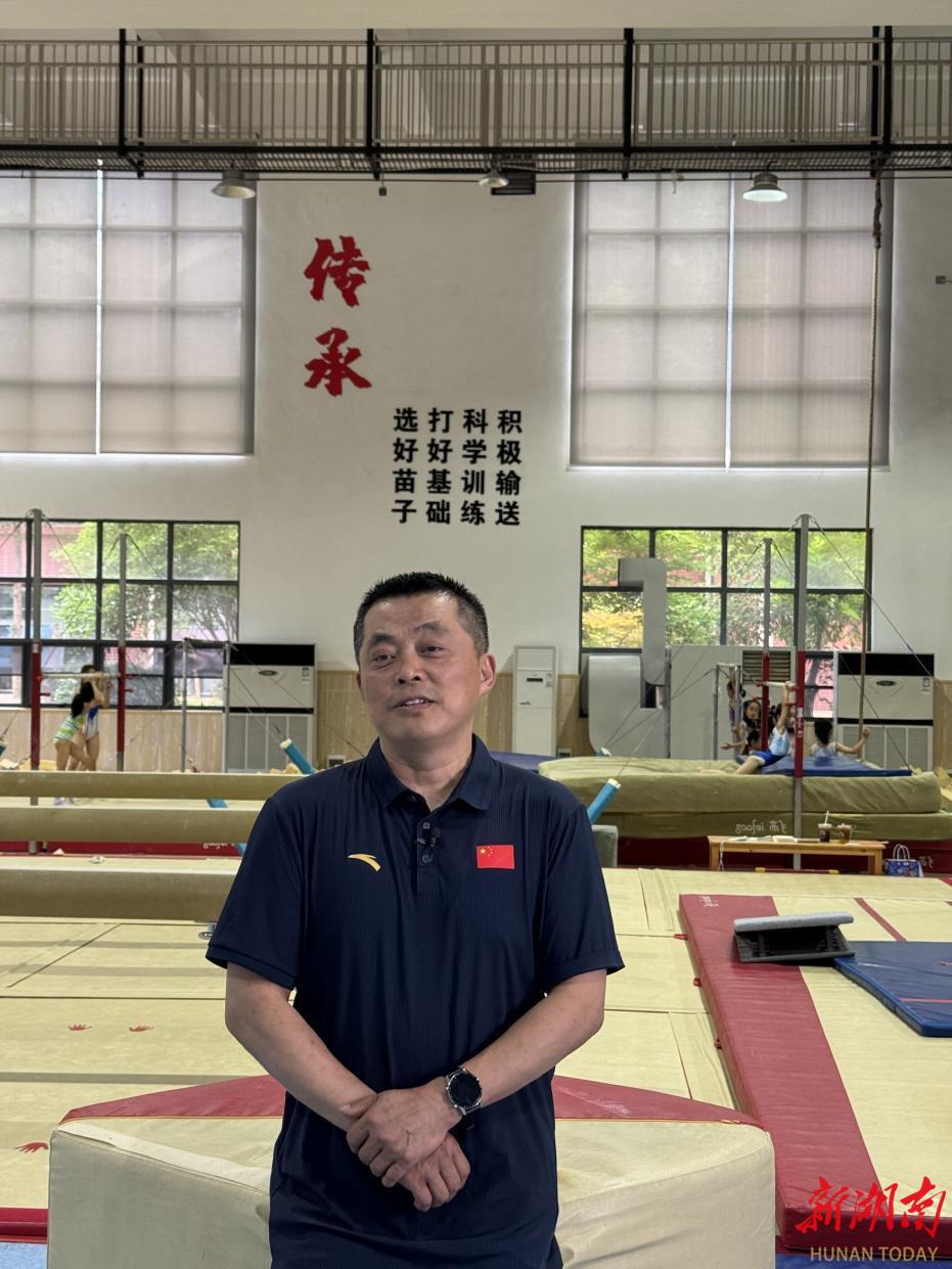 长沙市体操学校训练馆内,一群幼小的身影在训练器械上翻腾飞跃。邱琦站在场边,眼神紧跟着这些小运动员。