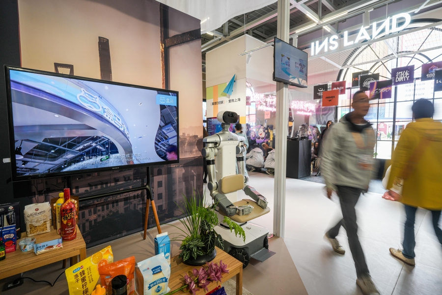 外滩风格的建筑立面,搭配弧形拱窗与精致铁艺,复刻传承百年的建筑美学。巨幕屏上的陆家嘴天际线与城市烟火,构筑起充满活力的国际消费中心城市场景。在第八届进博会主场馆中央广场,以“AI赋能,种草新消费”为主题的上海馆坐落其间,一走近,就有机器人上前打招呼:“您好,我叫小智,可以为您介绍上海馆的各类详情。”
