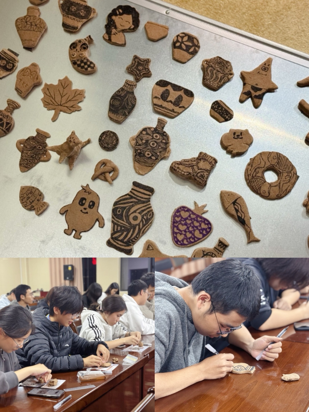 随后进入动手实践环节,同学们结合学到的文化知识,自由发挥创作黏土作品,复刻经典纹样感受古人的审美与匠心。在创作过程中,从揉泥、塑形到刻画纹饰的每个环节,大家相互交流、互相启发,讨论着彩陶文化的独特魅力。2025级新生张同学表示,这次活动让他对传统文化有了全新的认识,通过亲手制作黏土作品,不仅感受到了古人的智慧和匠心,更深刻理解了劳动创造美的真谛。