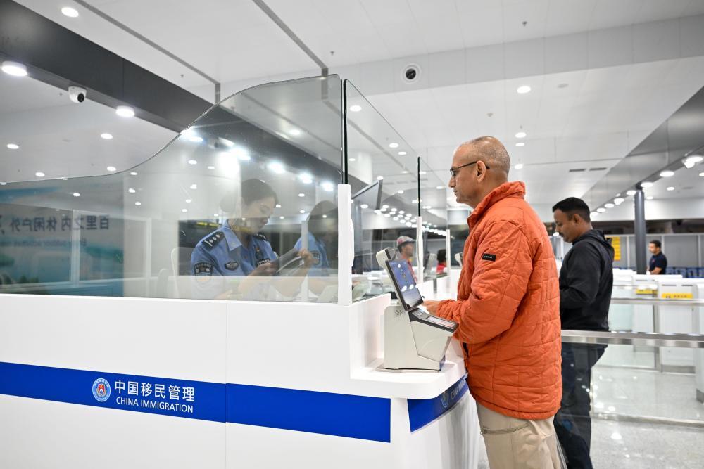8月27日,在天津滨海国际机场T1航站楼,天津机场边检站民警为来津参加2025年上海合作组织峰会的外方记者办理入境手续。 新华社记者 孙凡越 摄