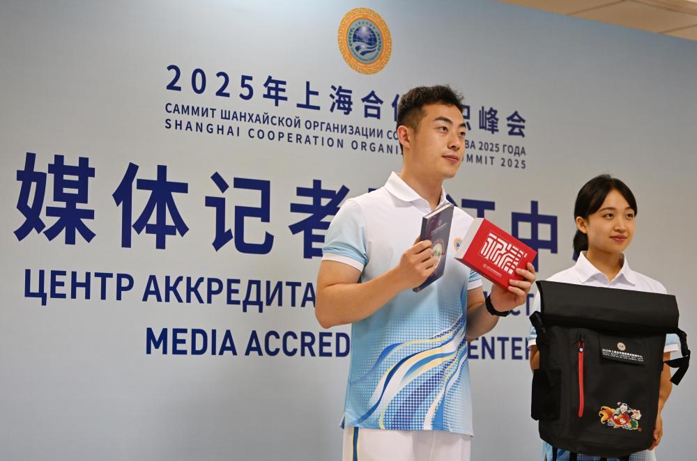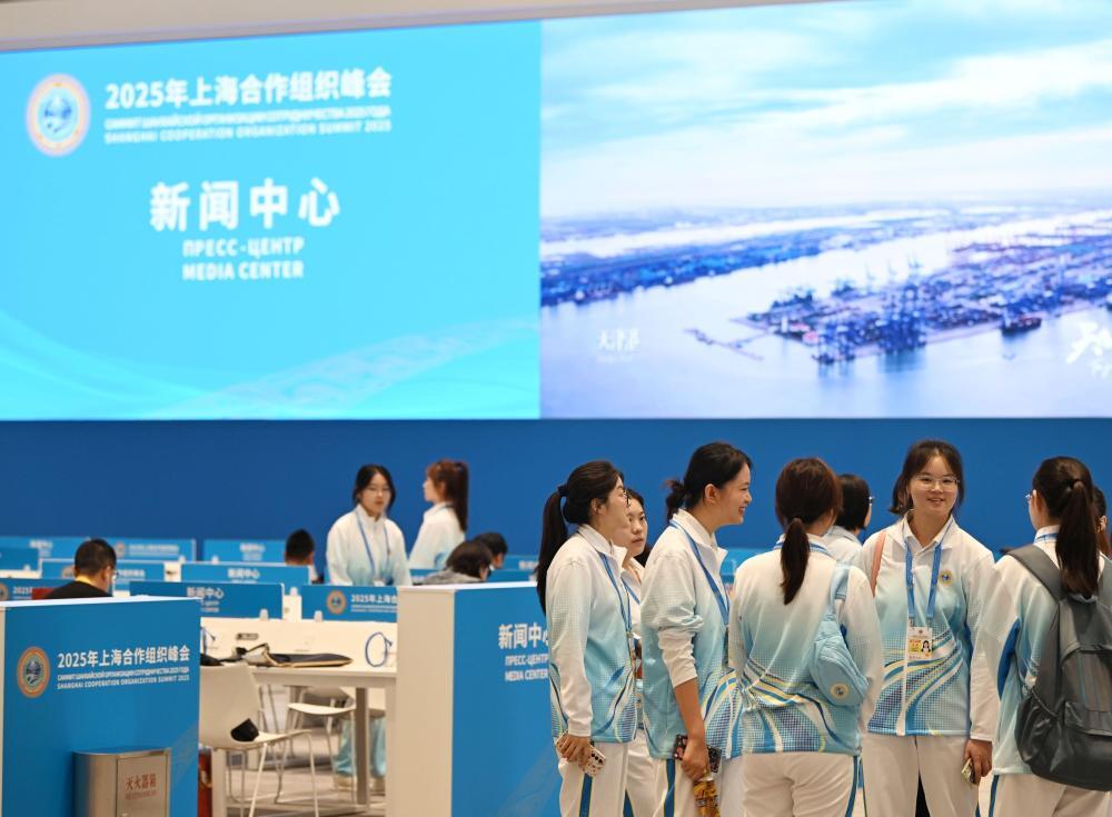8月30日,志愿者在2025年上海合作组织峰会新闻中心服务记者。 新华社记者 张笑宇 摄