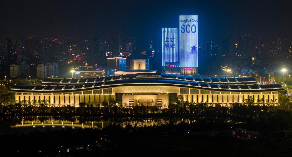 这是8月26日拍摄的2025年上海合作组织峰会主会场附近夜景(无人机照片)。 新华社记者 赵子硕 摄