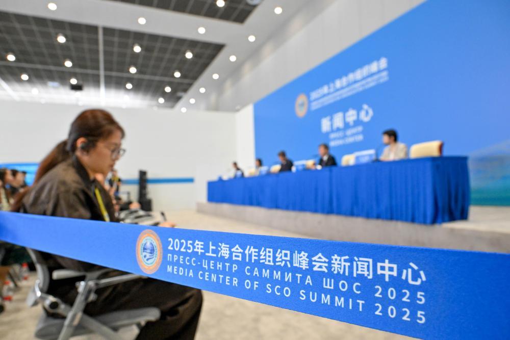 这是8月28日在2025年上海合作组织峰会新闻中心拍摄的首场吹风会现场。 新华社记者 孙凡越 摄