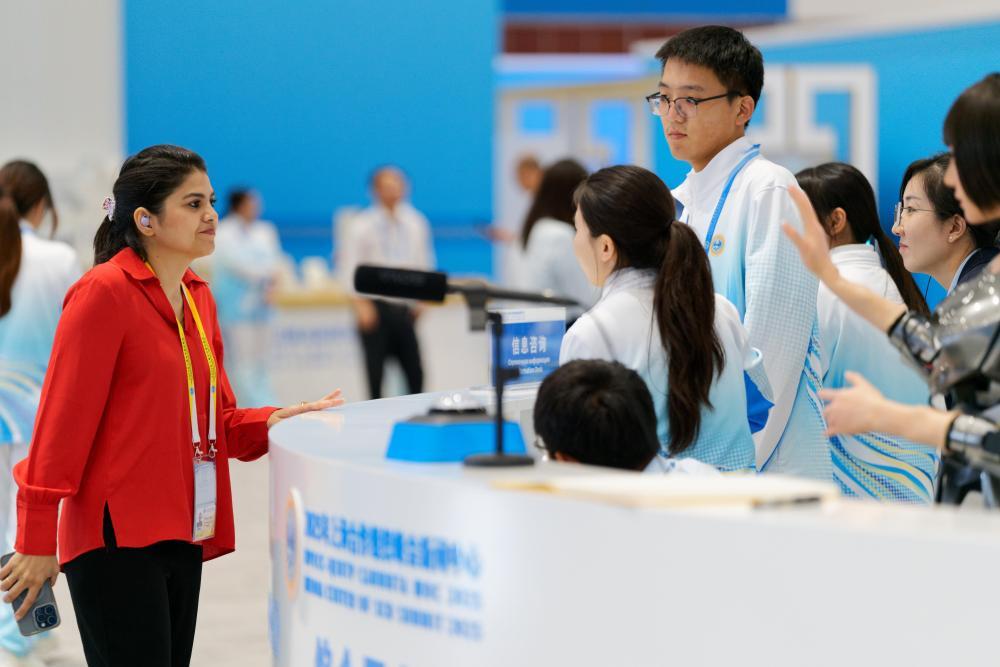 8月28日,志愿者在2025年上海合作组织峰会新闻中心交流。 新华社记者 李然 摄