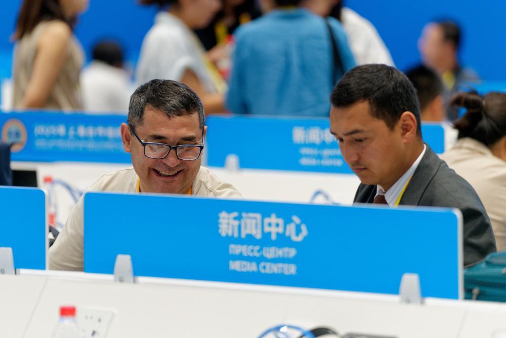 8月29日,外籍记者在2025年上海合作组织峰会新闻中心采访。 新华社记者 赵子硕 摄