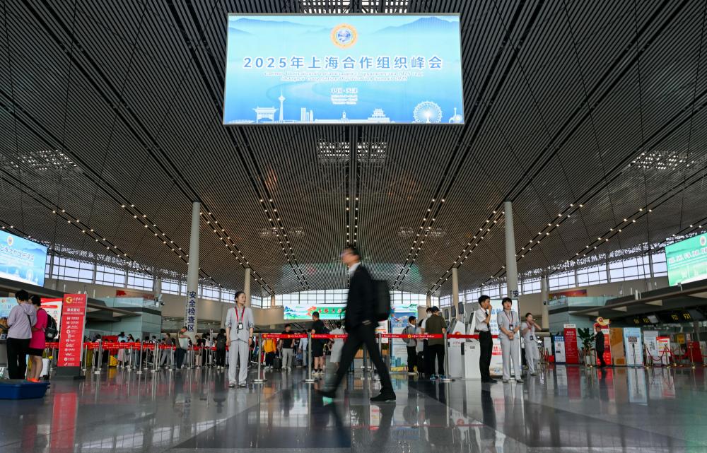 8月27日,在天津滨海国际机场T2航站楼,旅客经过2025年上海合作组织峰会宣传条幅。 新华社记者 孙凡越 摄