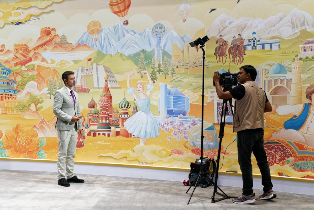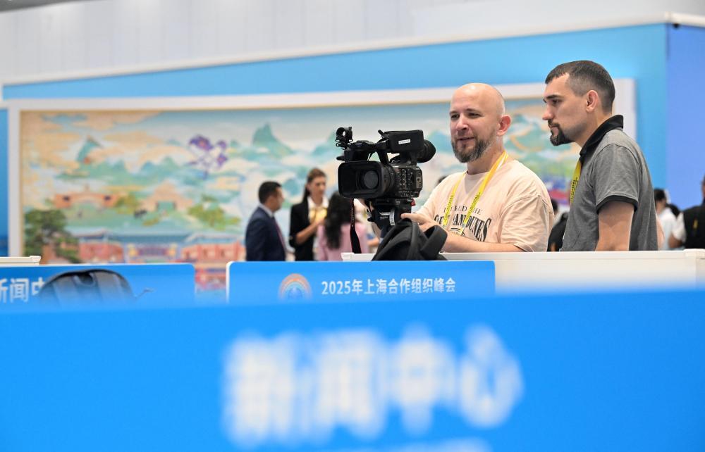 8月30日,记者在2025年上海合作组织峰会新闻中心内采访。 新华社记者 孙凡越 摄