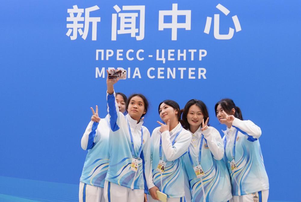 8月29日,志愿者在2025年上海合作组织峰会新闻中心合影。 新华社记者 杨青 摄