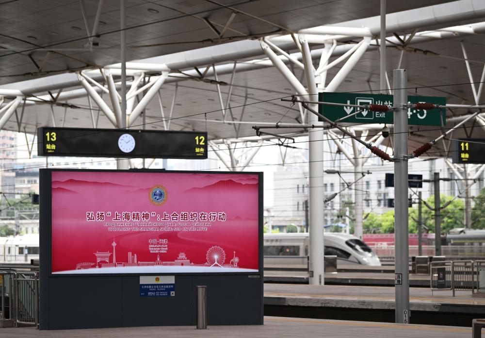 8月27日拍摄的天津站站台上的峰会宣传海报。 新华社记者 李然 摄